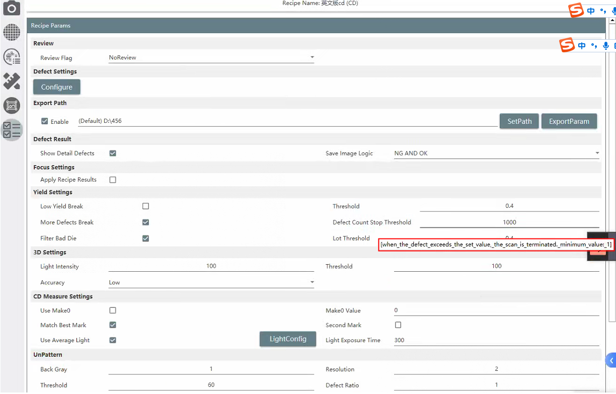 6.系统设置页面,鼠标放在UnPattern的Defect Ratio右边的输入框时,提示信息格式不对。