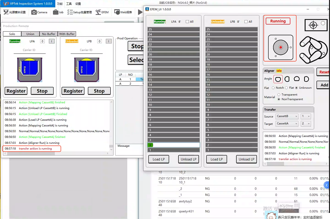 已关闭EFEM页面选择一个有基片的槽位,点击Add按钮,提示错误信息“transfer action is running”