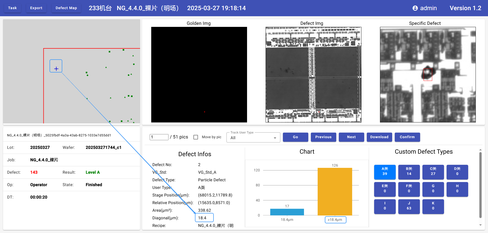1.VIS端已设置缺陷尺寸区间,对角线小于18.4μm的缺陷应该为黄色,对角线大于等于18.4μm的缺陷应该为绿色。