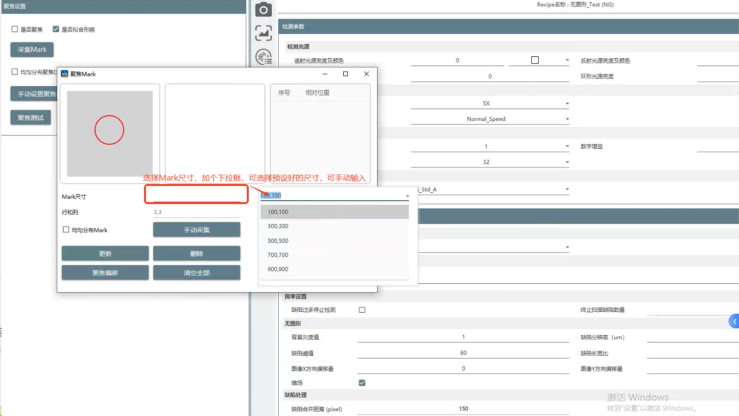 已关闭优化:拟合聚焦采集Mark点,选择Mark尺寸,加个下拉框,可选择预设好的尺寸,可手动输入尺寸