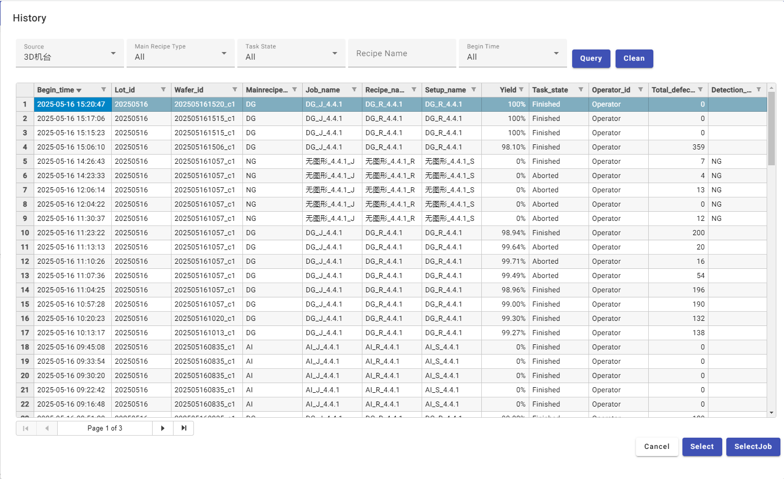 2、通过main recipe type条件筛选(筛选出的第一条检测任务缺陷数量不为0)