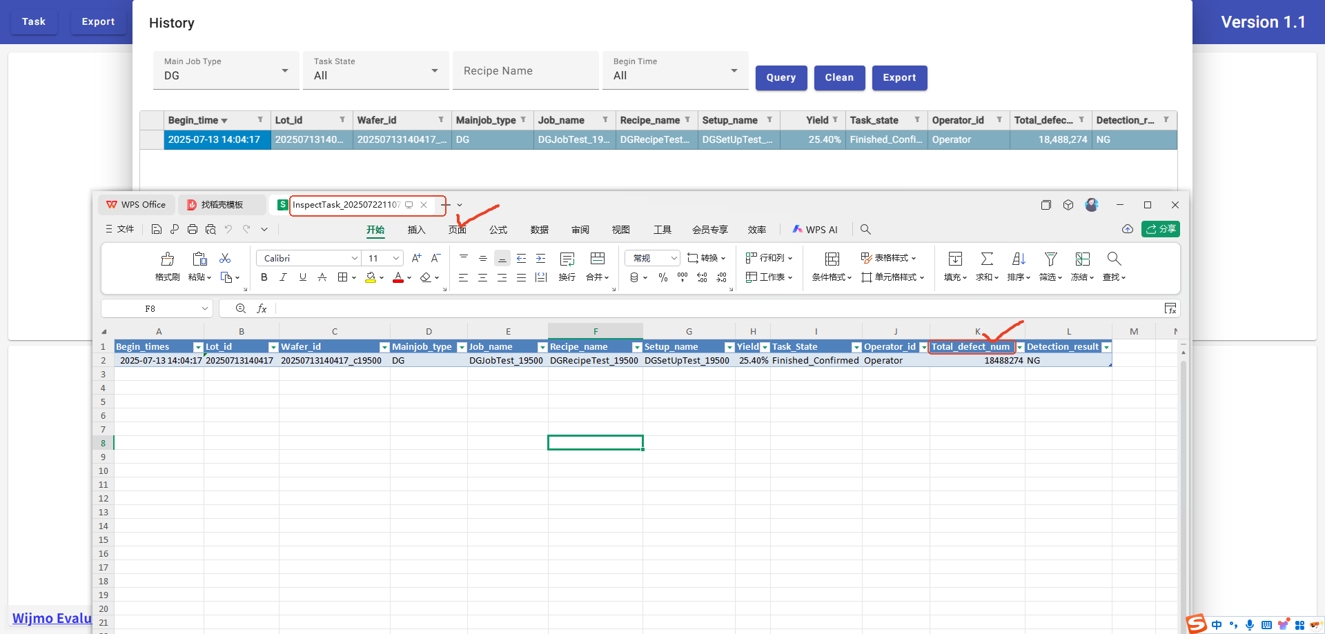 4.导出的excel表格中当前导出的是Mainjob_type为NG类型的任务,但Inspect_type却显示Die to Golden类型。