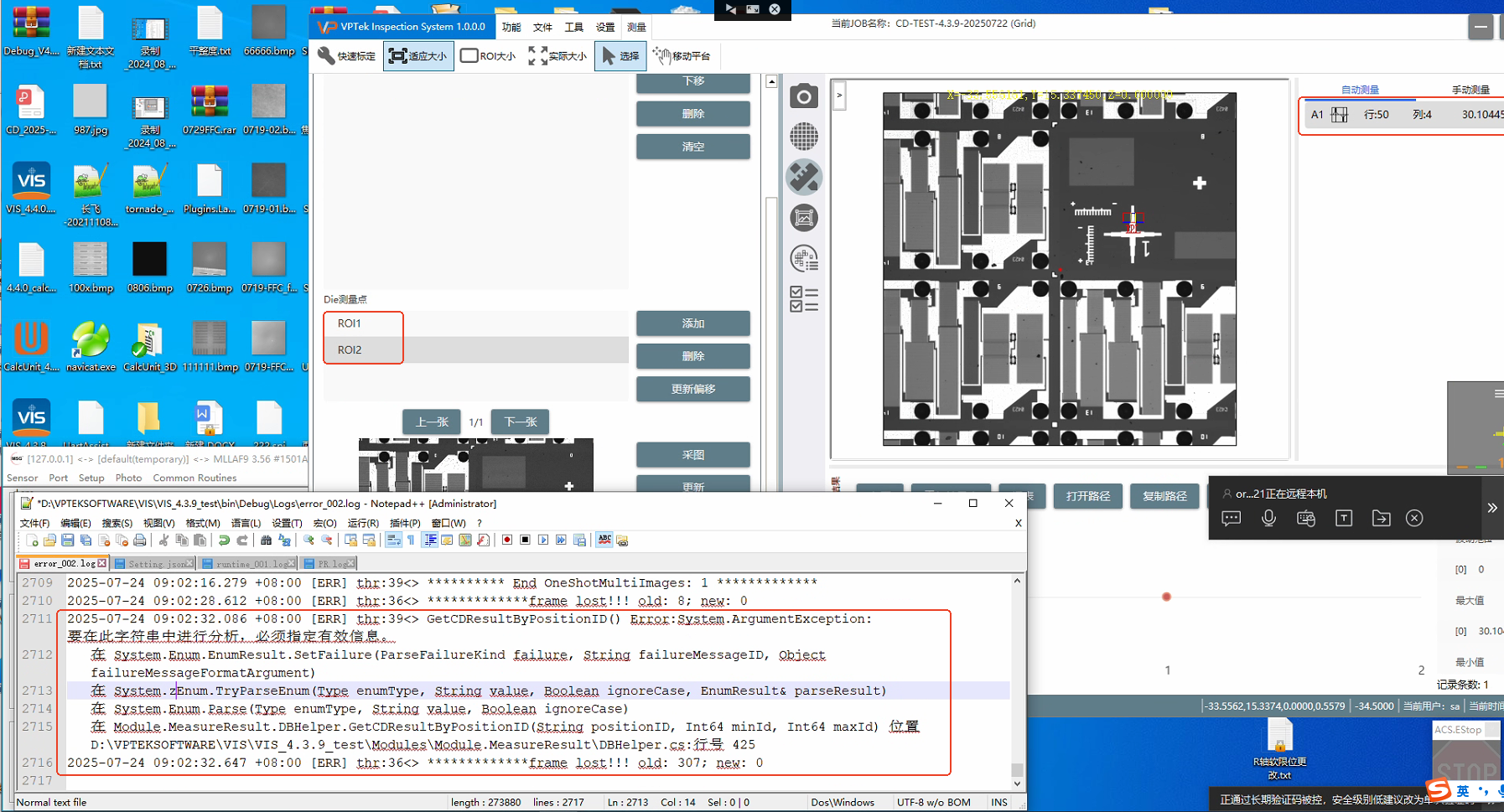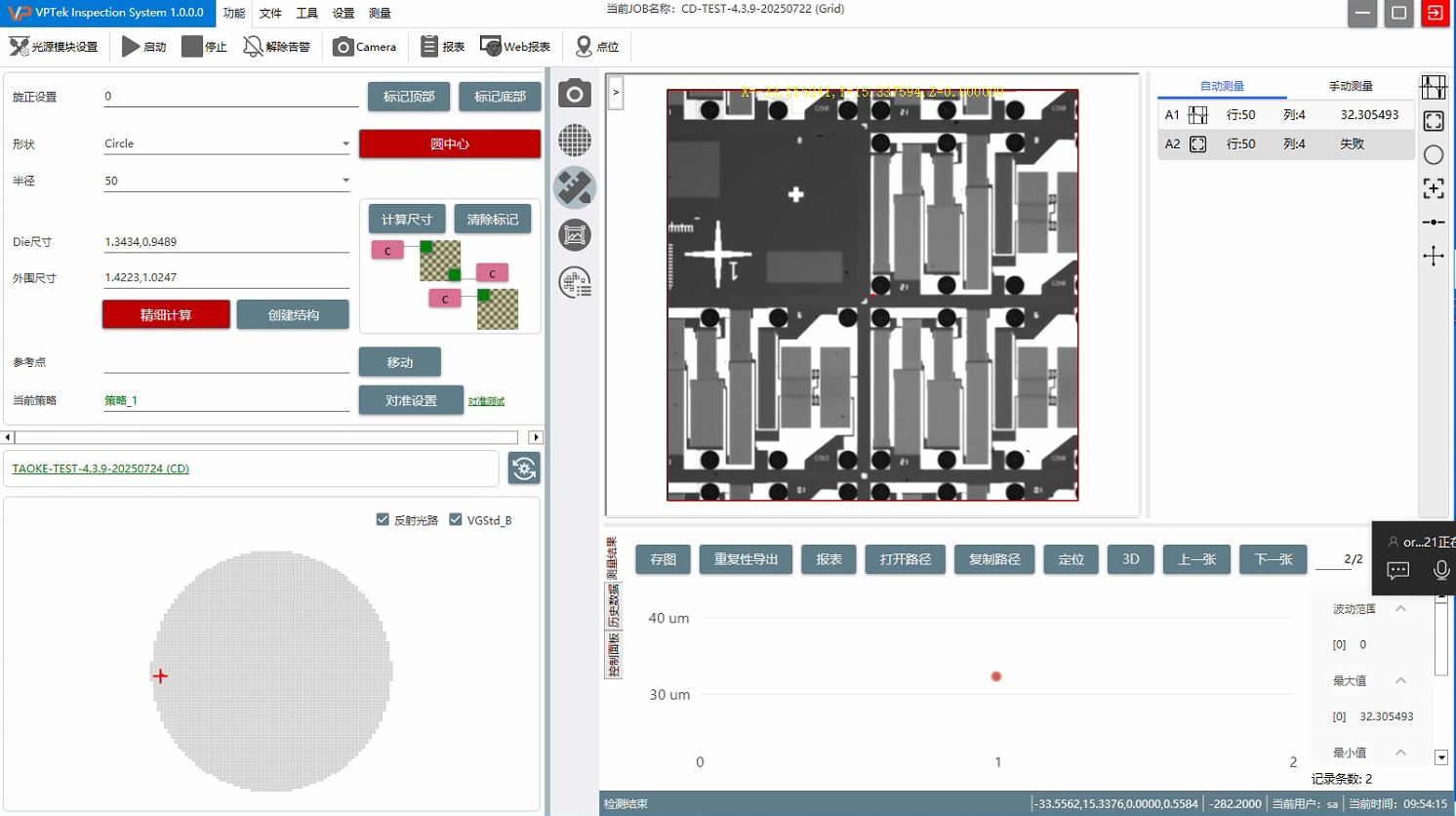 已关闭CD类型的程式有两个Die测量点,第2个套刻算法对应的测量点ROI2提示未找到Mark,手动点击跳过按钮,检测完了后自动测量结果页面没有测量点ROI2的测量结果