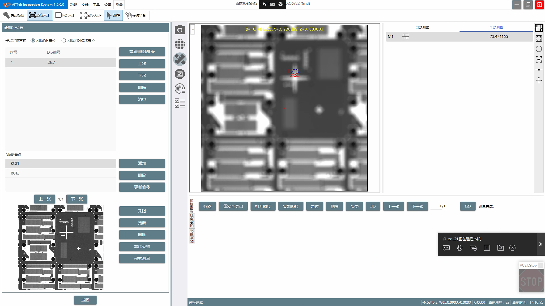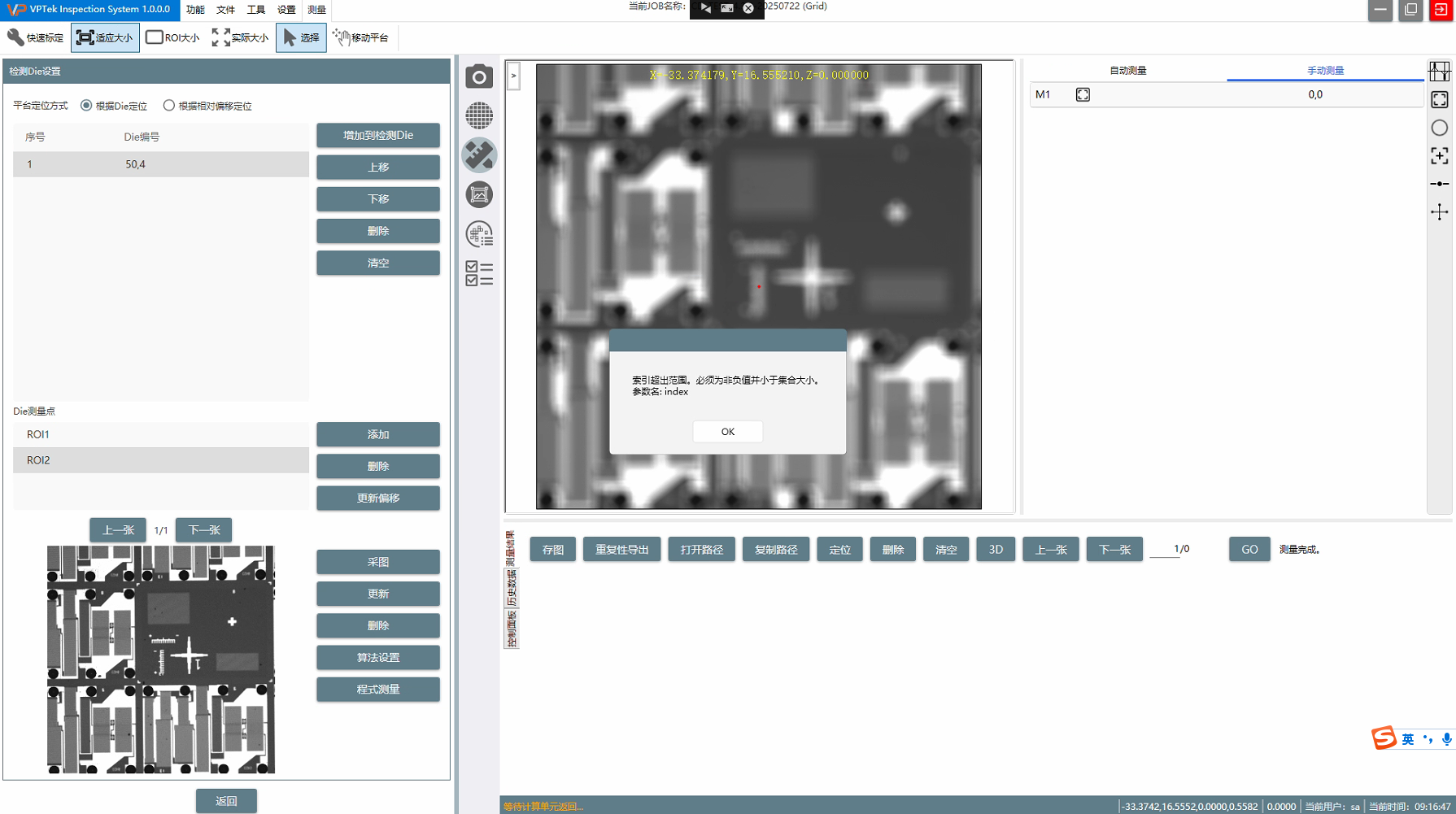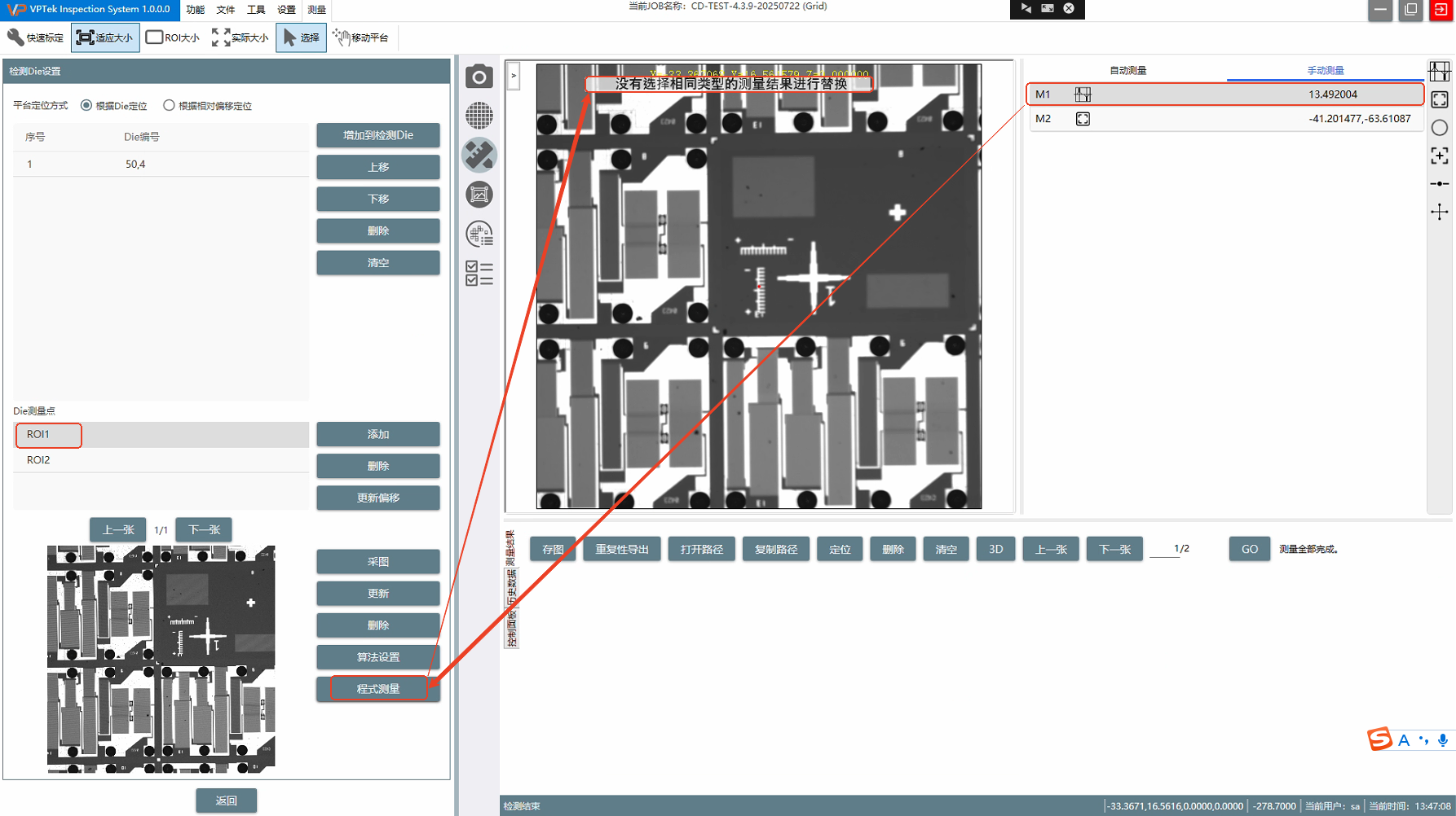 当前Die测量点ROI1是GrayCD算法,在手动测量结果中选中也是GrayCD算法的结果,进行程式测量的替换当前操作,也报错,请确认。