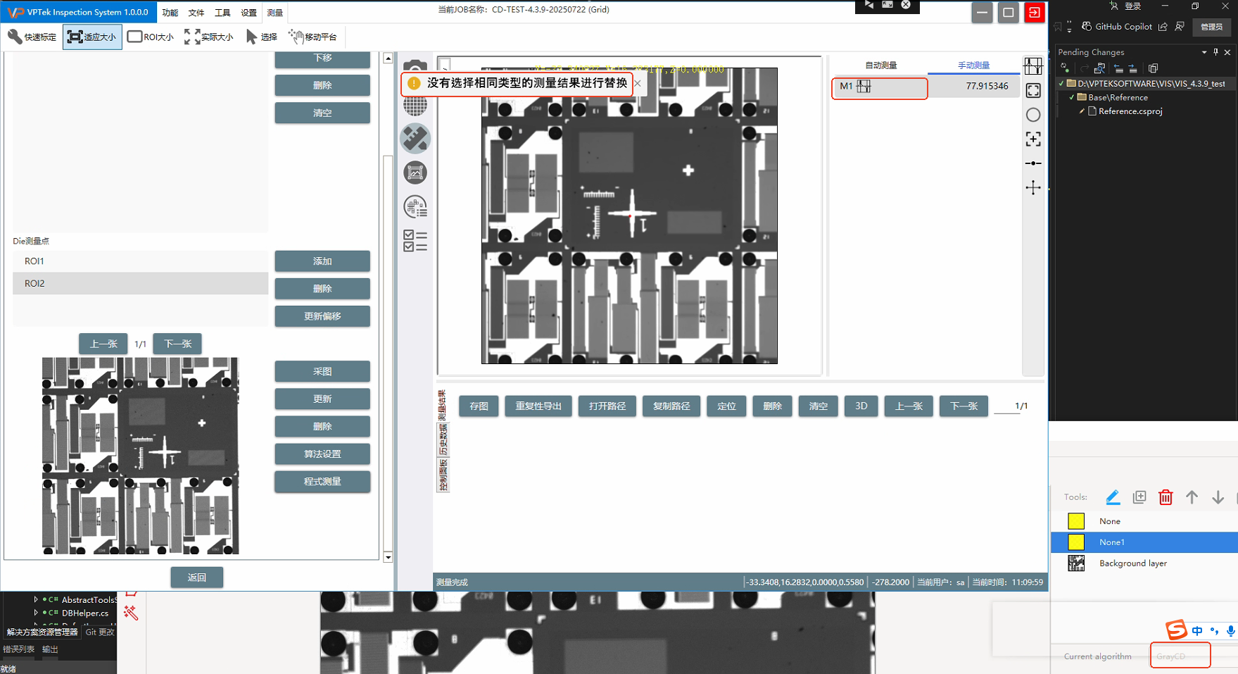 已关闭先选中手动测量结果中的M1(对应算法是GrayCD算法的),再点击Die测量点ROI2(对应算法也是GrayCD算法)的程式测量的替换当前操作,仍提示“没有选择相同类型的测量结果进行替换”