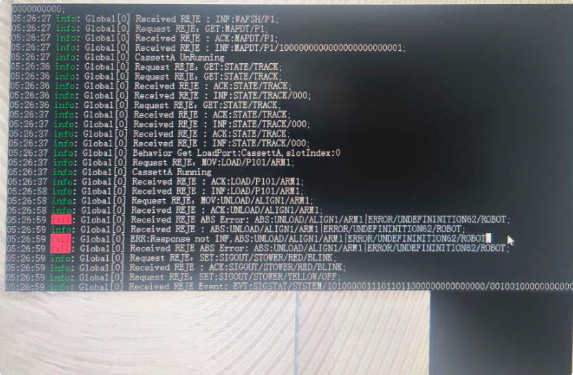 重启服务后,对任意LP位置的Foup开盒扫片,再执行Reset操作,会出现“undefininition62”系列报错,并触发蜂鸣器报警。