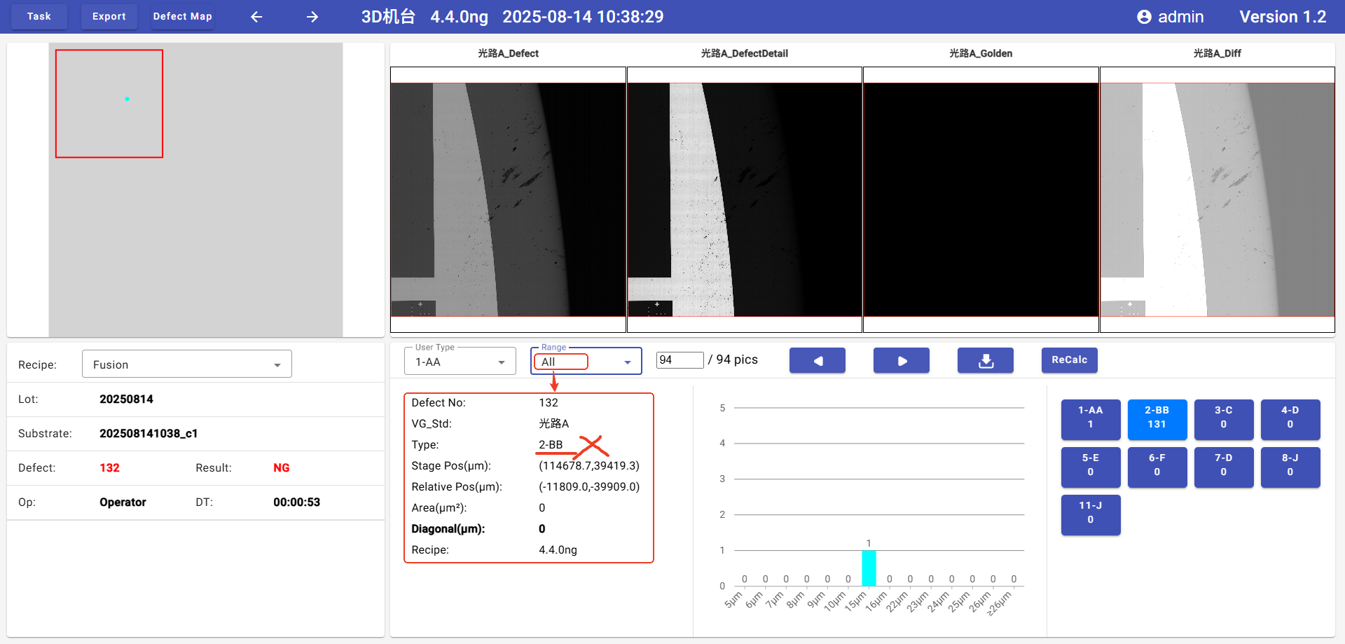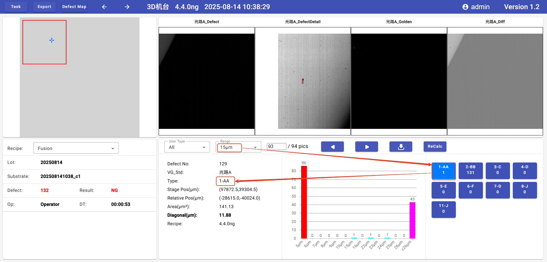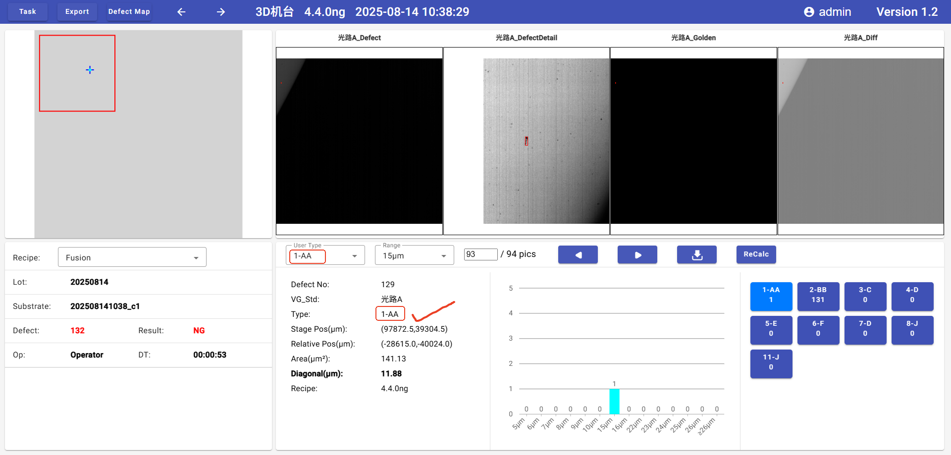 2.将User Type改为1-AA,Range为15um不变,缺陷信息显示正确。