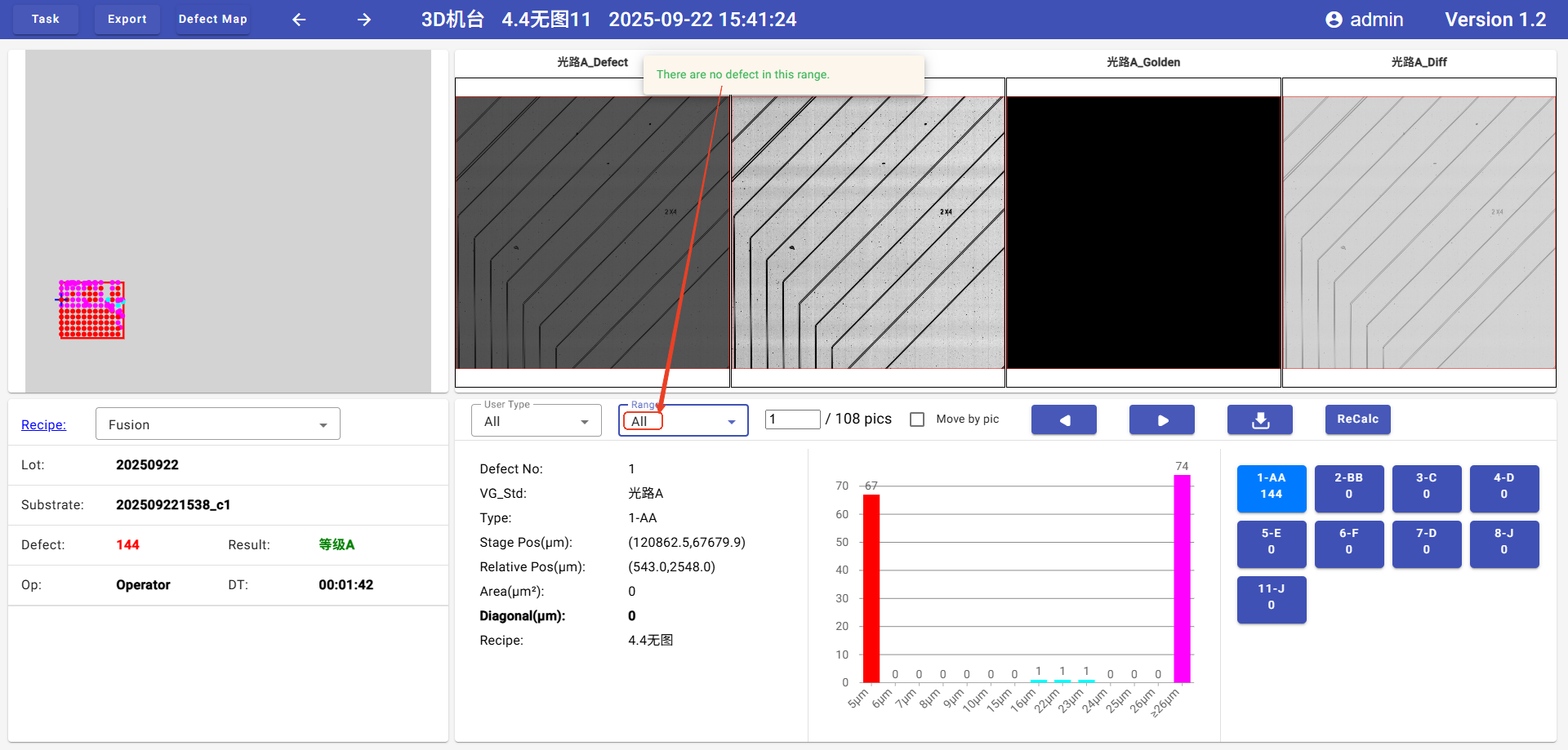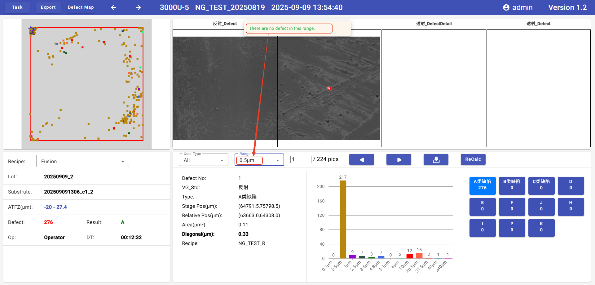已关闭先在Range处选择一个缺陷个数不为0的尺寸区间(如0.5um),再点击下一个任务按钮,然后在新任务详情页面的Range处选择缺陷个数为0的尺寸区间,Range处数值自动变成了0.5um,应该自动变成All