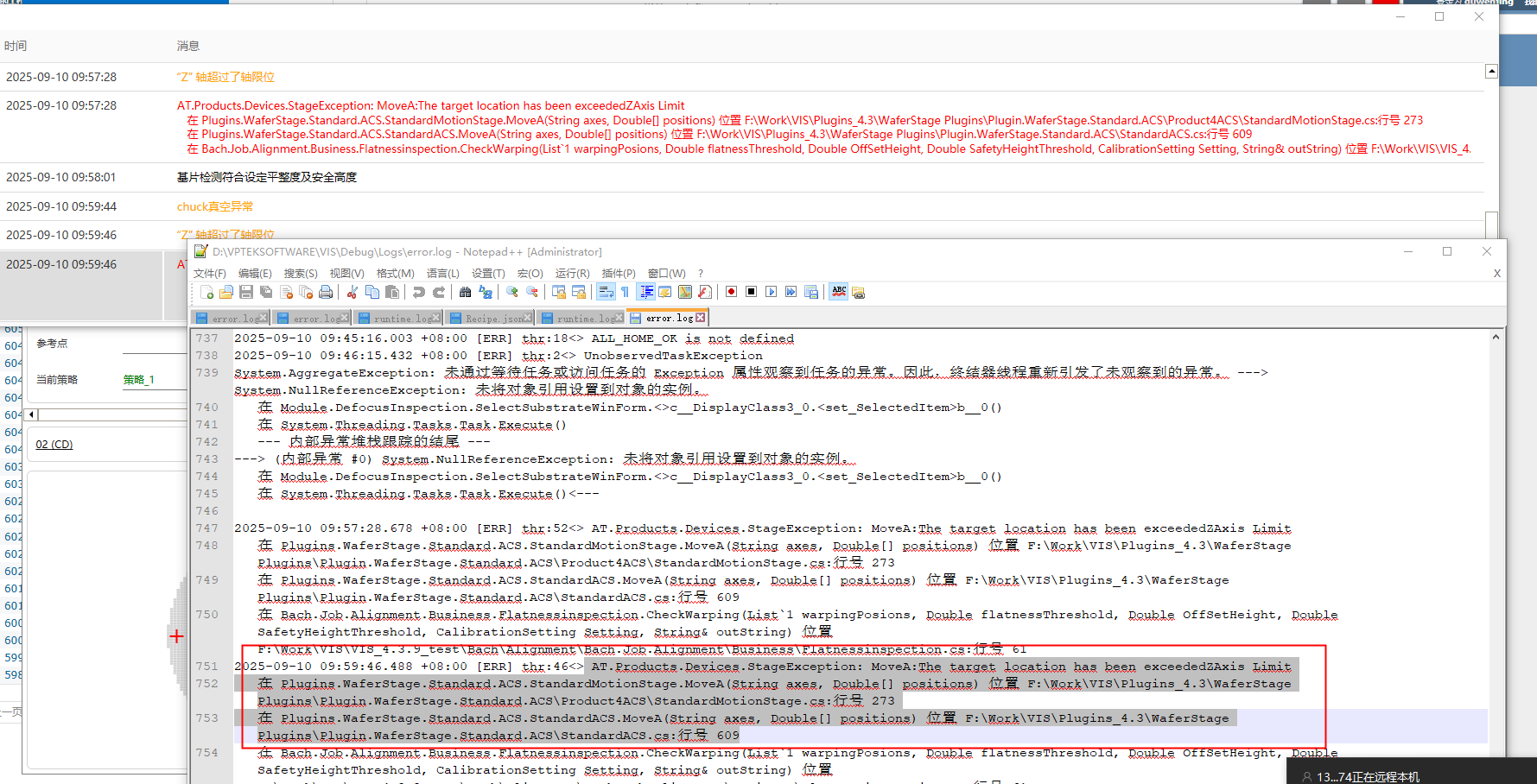 z超过限位,error里面有日志输出,vis状态栏中也重复输出