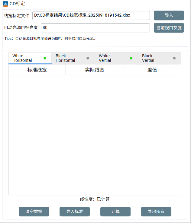 2.导入一个文件, 文件中包含自动光源目标亮度以及标准线宽,实际线宽和差值数据会在页面显示 ,线性度数据不体现在页面上,只在页面显示其状态 【线性度:已计算】/【线性度:未计算】 。