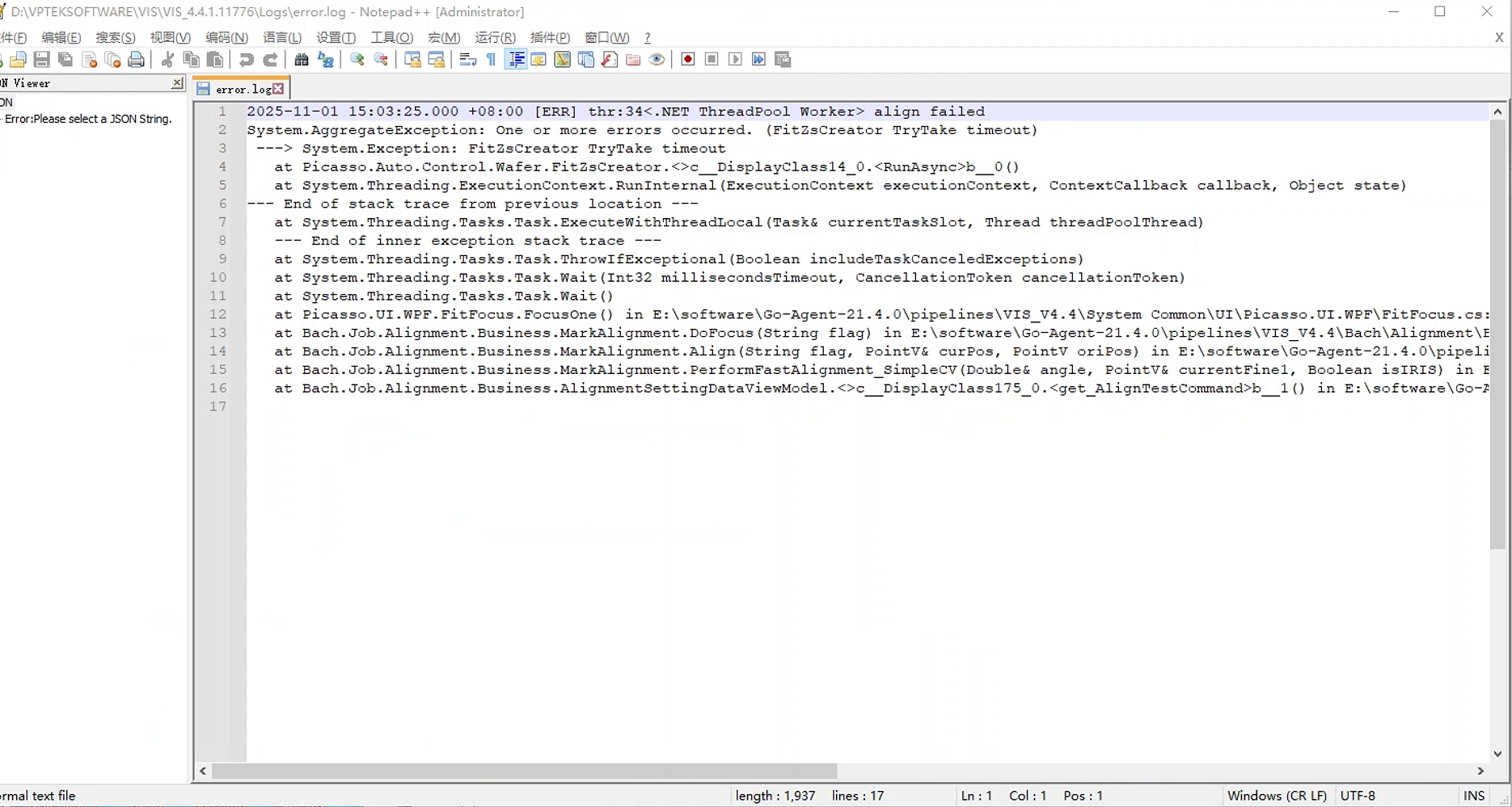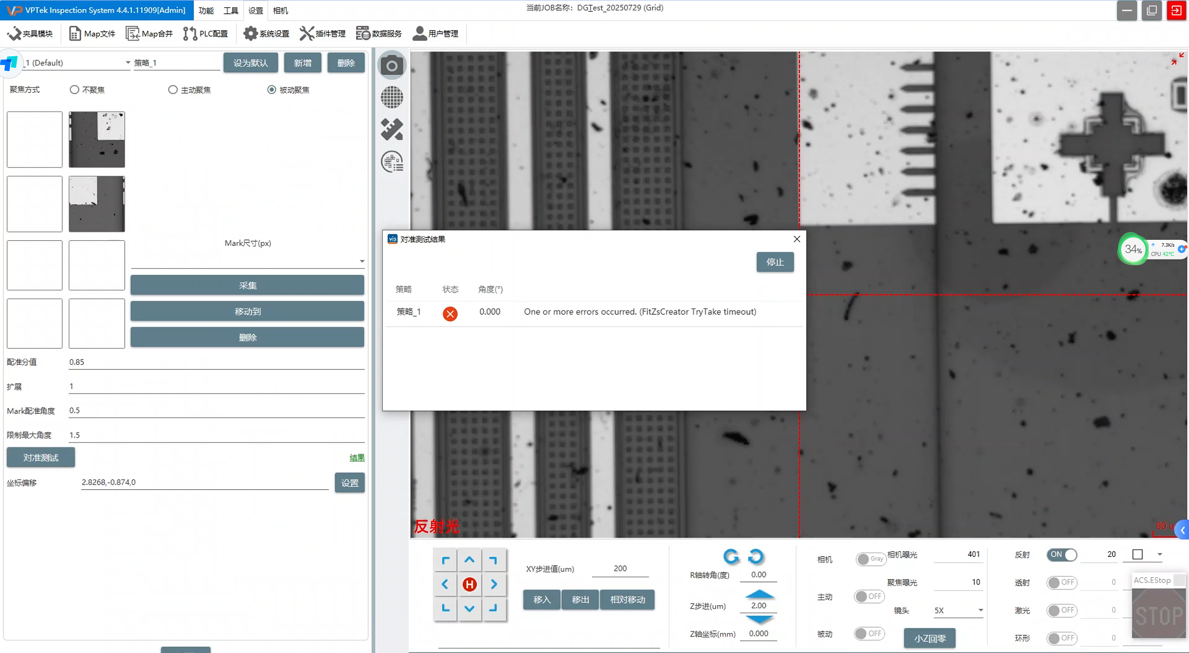 打开对准的时候选择被动聚焦(硬触发),会有超时报错(VIS4.4.1.11909)
